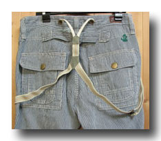 Lady EDWIN People At Wolk KL1106 完売 サスペンダ^ワークパンツ 104)ヒッコリー 綿88% 麻12% 牛皮 ラベル XS,S,M 日本製 本体価格=¥9.500- +税